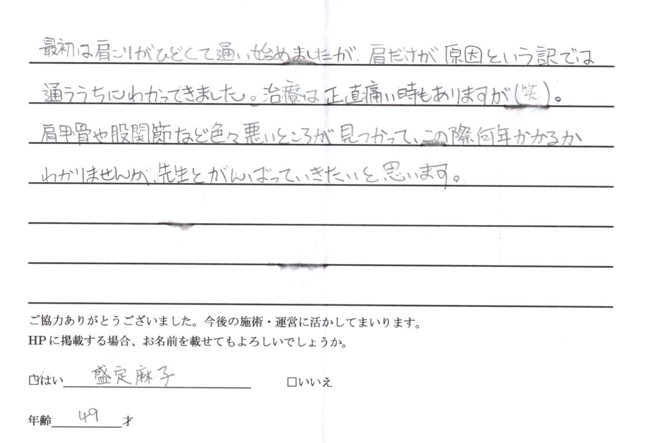 先生とがんばっていきたいです! 最初は肩こりがひどくて通い始めましたが、肩だけが原因ではないと通ううちにわかっていました。治療は正直痛い時もありますが(笑)。肩甲骨や股関節など色々悪いところが見つかって、この際何年かかるかわかりませんが先生とがんばっていきたいと思います。 <ALL>